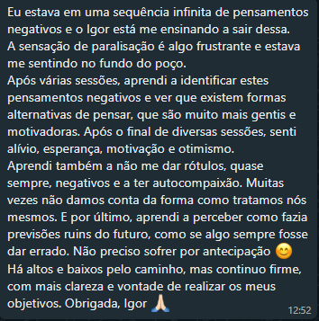 Alguns feedbacks que alguns pacientes gentilmente compartilharam sobre a terapia.